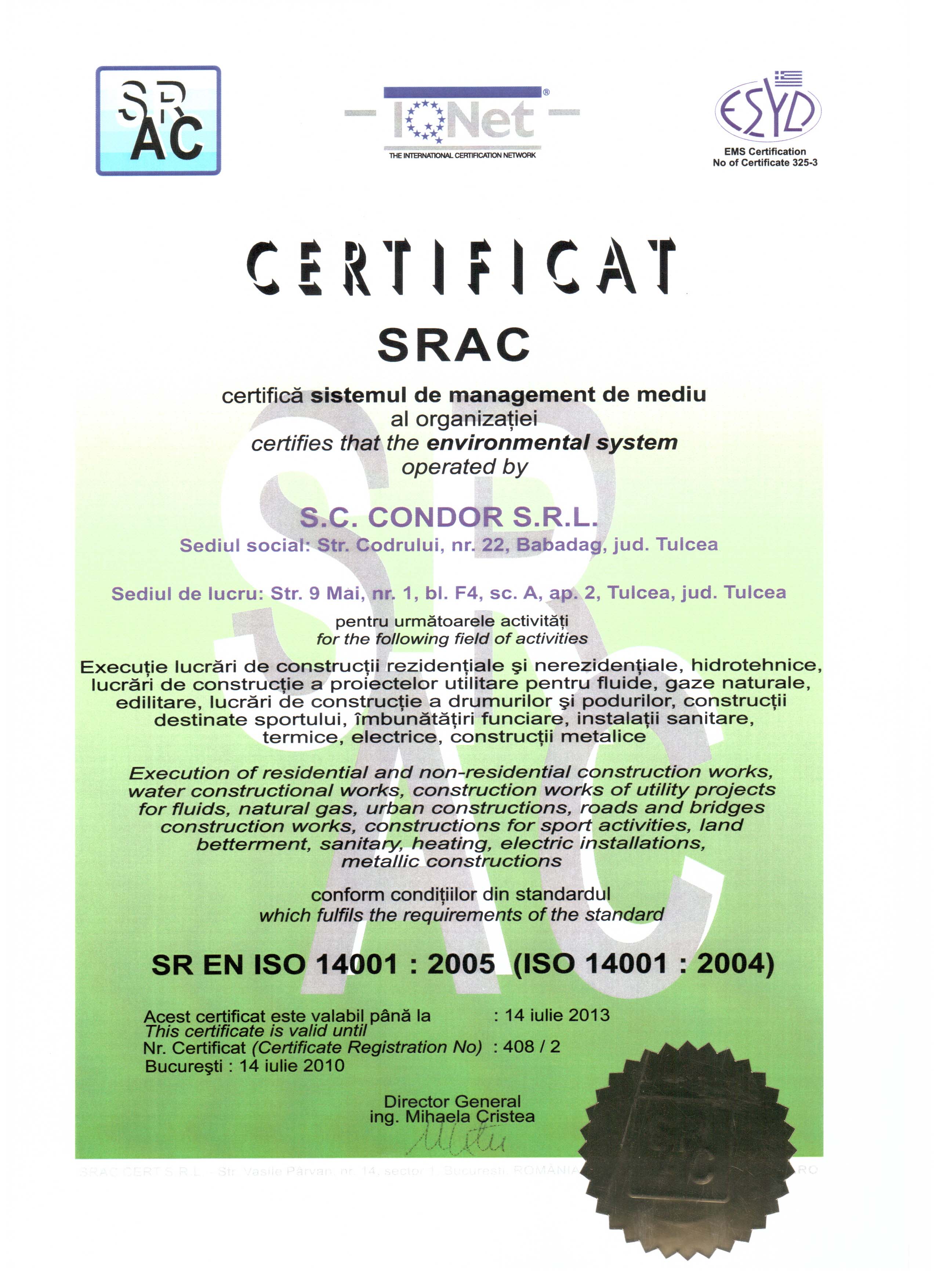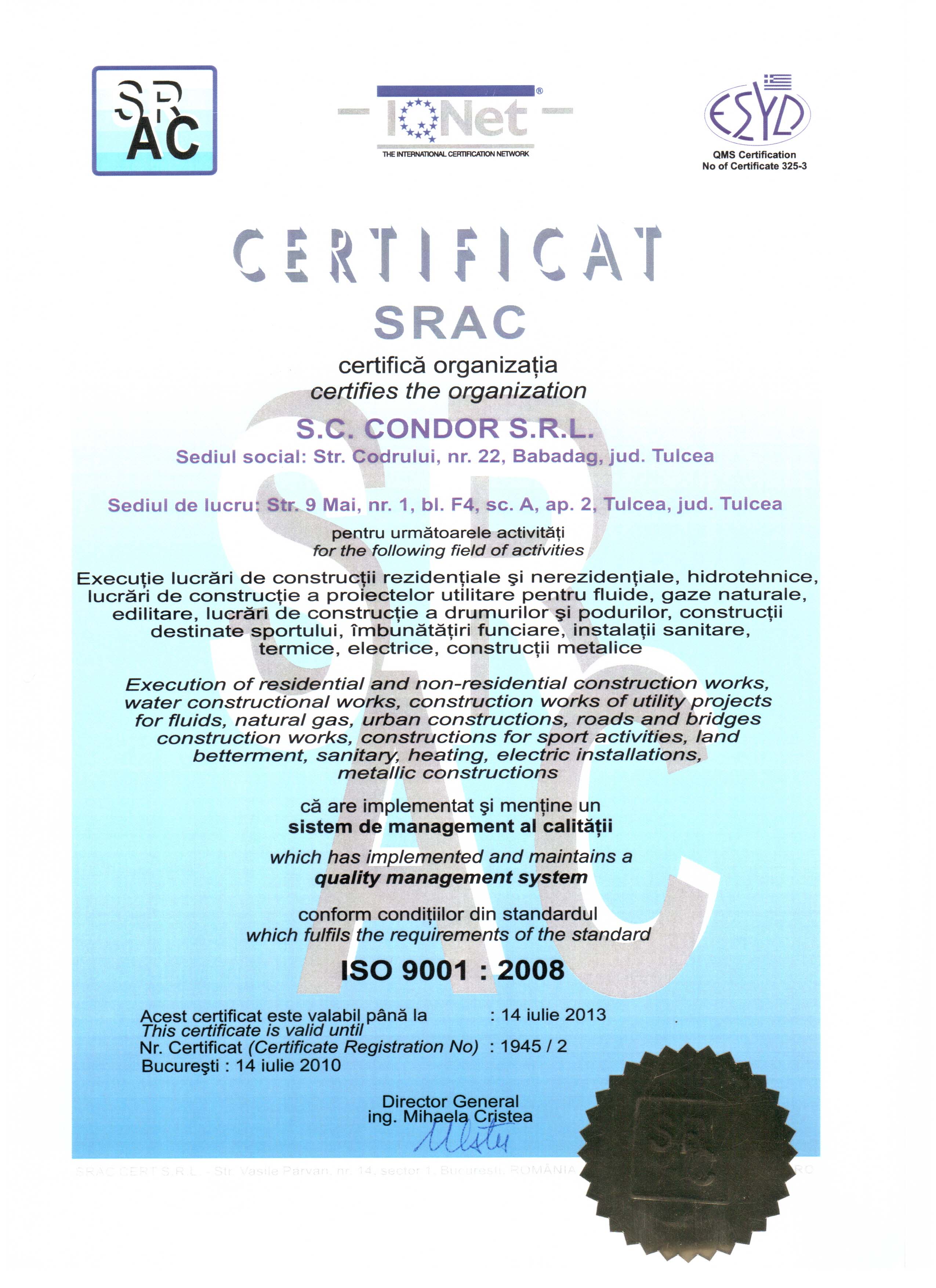 Condor SRL a proiectat si implementat Sistemul propriu de management integrat al calitatii, mediului, sanatatii si securitatii ocupationale.