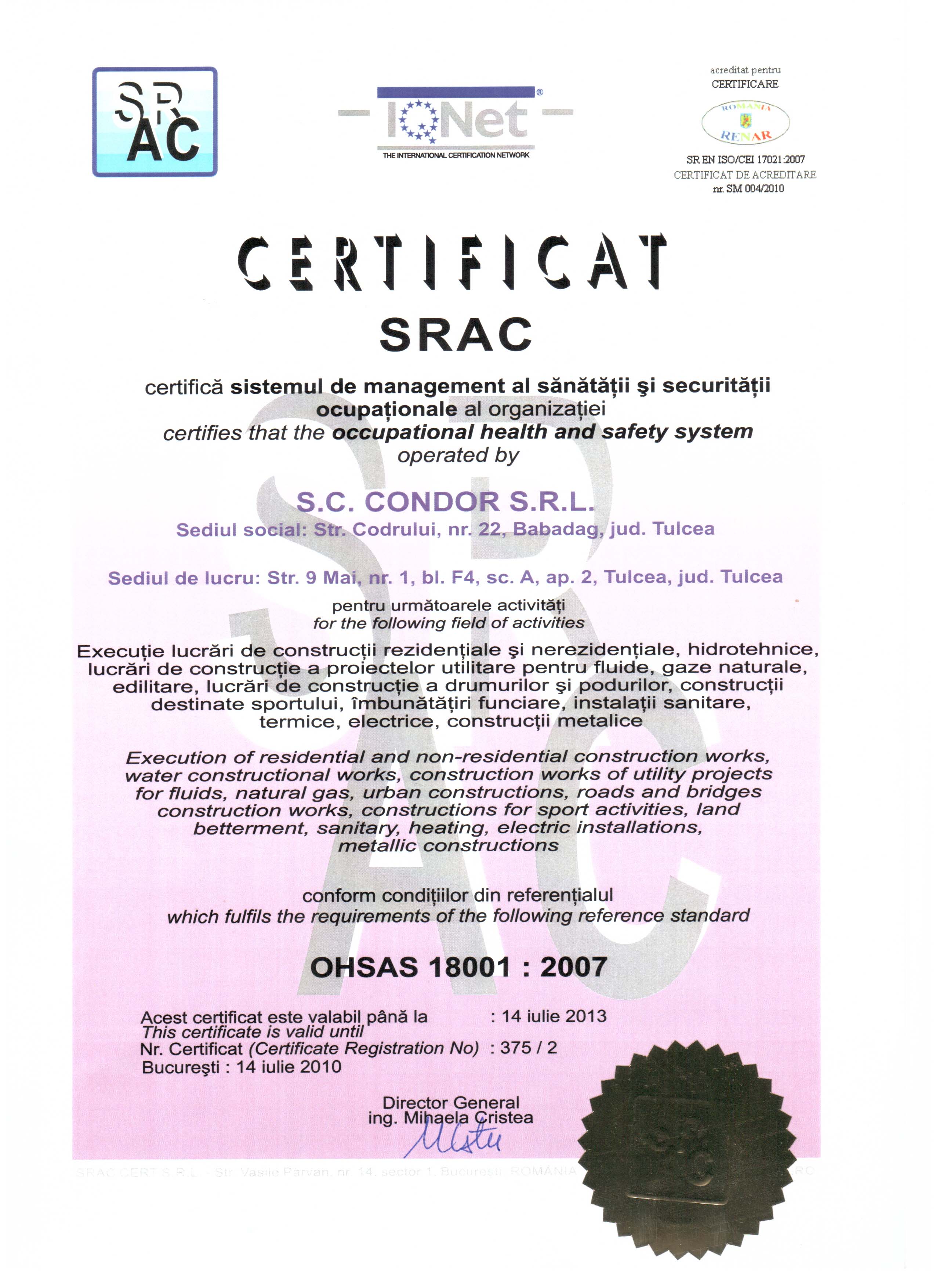 Condor SRL a proiectat si implementat Sistemul propriu de management integrat al calitatii, mediului, sanatatii si securitatii ocupationale.